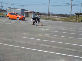 「じゃー、あの駐車場の石を掃いてもらおっかなぁ」