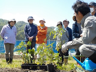 開園当初からお世話になっている肥田野アドバイザーの提案で、利用者さんに植え付け指導した事がないので、菜園体験の場を借りて説明しましょうと言う事になりました。
