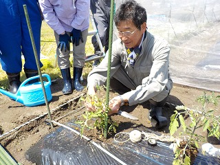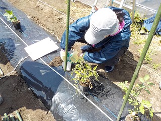 今回は4m×4mの畑に3本の畝を作り、トマト・ミニトマト赤、黄・なす・ピーマ・枝豆を栽培する体験で、1畝はご自分の好きな物を栽培してもらいます。