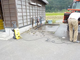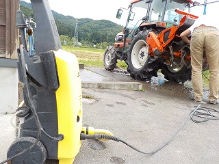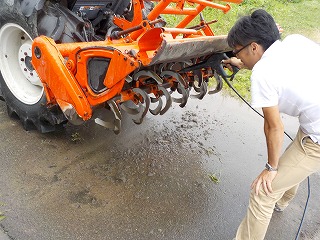 246月 シャーッと Posted by: yonekurafureai Categories: ブログ No comments トラクターの洗浄を引き受けたものの、トラクターの土って中々落ちないんですわ。 まず手で土を落とさないと、と手袋をしてボタボタと落としてホースで水を掛けながらブラシをゴシゴシ。 っとその時、専業農家の津村さんが来て「これね、作業が終わったら砂利道をガーッと走ると落ちるよ。」と教えてくれました。 そーなんだっ!! ・・・でももう洗っちゃったから、早く知りたかった。 ちまちまとやっていましたが、思い出しました。 農園には高圧洗浄機があった事を。早速出して作業開始。 ビャー、ジャー 面白い様にきれいになりました