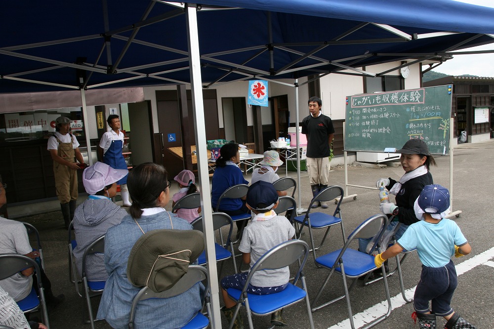 187月 2018.7.14じゃがいも収穫体験 Posted by: yonekurafureai Categories: ブログ No comments 熱中症が気になる7月14日 じゃがいも収穫体験が行われました。 挨拶もそこそこに曇っている今だ!と体験をスタート。 生育が悪かったものの、土は乾いていたので掘り起こす作業が楽だった様で「もっと掘りたいぃ」とのリクエストを受け、キャンセルが出た畝も掘ってもらいました。 モグラがいた!いや、ネズミだ!と賑やかに収穫してもらいました。 計量も済んでテントに戻ると太陽が顔を出し、ギリギリ楽しい体験のまま終了しました。 参加頂いた皆様、ありがとうございました。