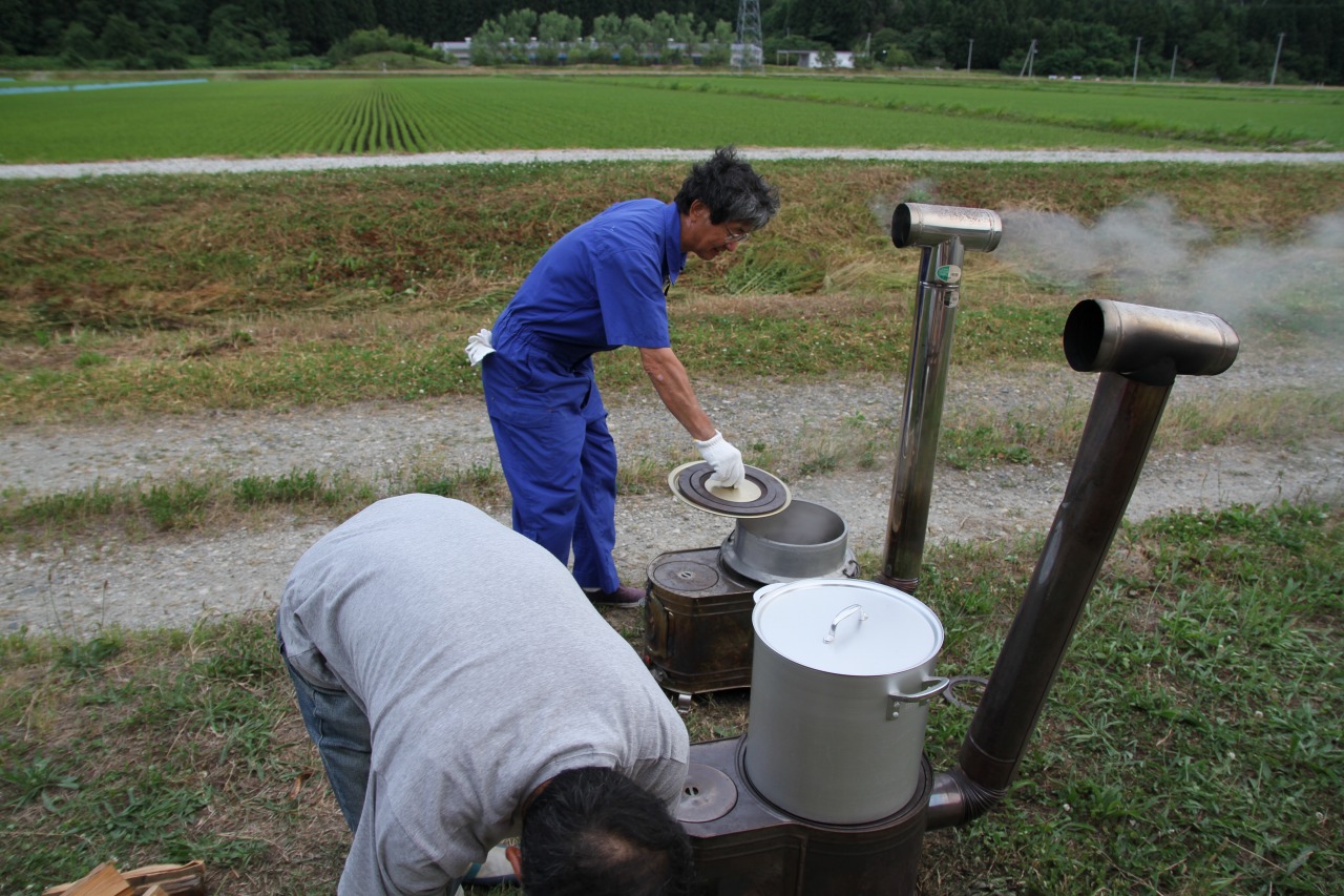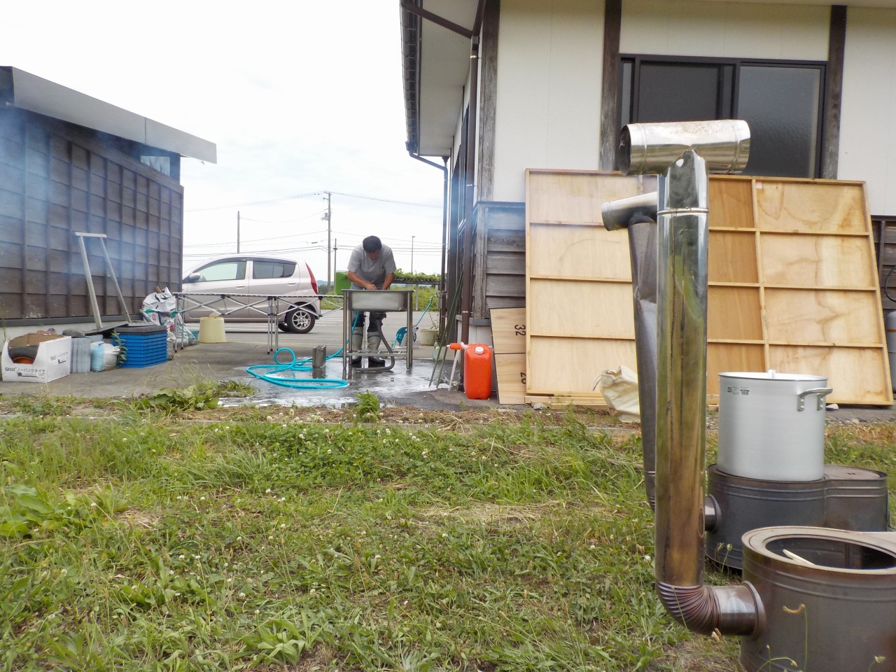 農園の裏で竈が二個準備され、いよいよ始まります。でもちょっと風が強すぎっ。