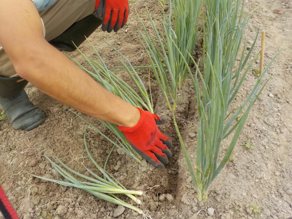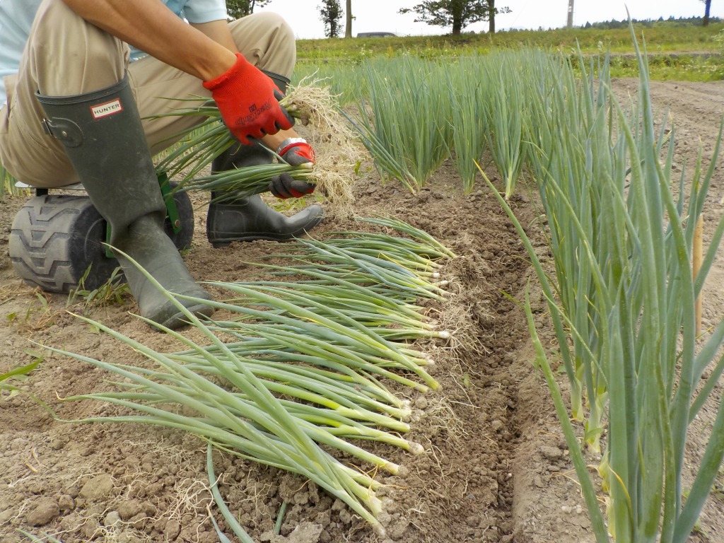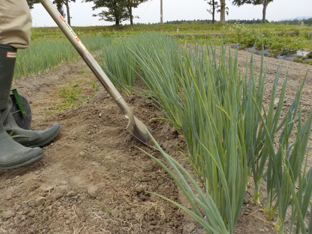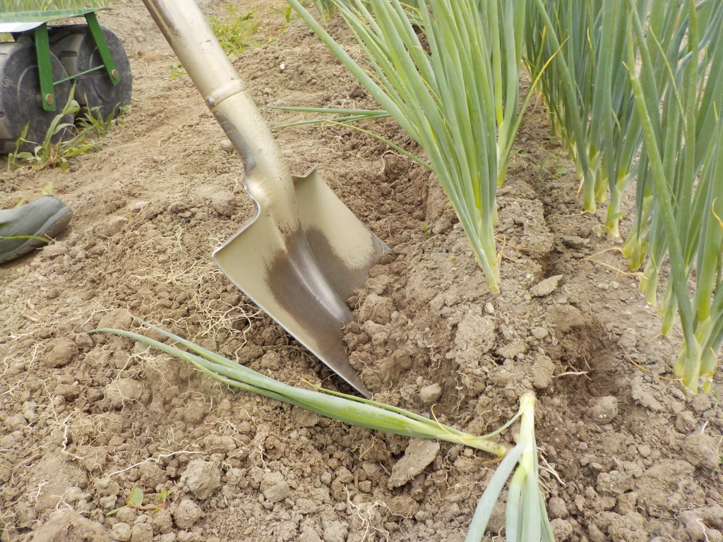 まずネギのラインに沿ってシャベルで根っこを起こします。